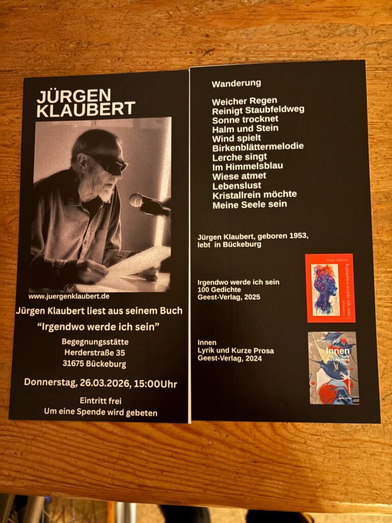 Autorenlesung 26.März 2026 in der Begegnungsstätte Bückeburg Veröffentlicht am 22. Februar 2026 Bitte vormerken! Ich freue mich auf euch! Read more posts about Uncategorized Vorheriger Beitrag Kurze Gedichte aus „INNEN“ Keine neueren Beiträge Zurück zum Blog